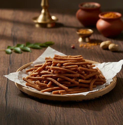Ragi Karapusa is a traditional South Indian crunchy snack prepared using nutritious finger millet (ragi) flour blended with mild spices and shaped into thin, slightly twisted sticks.